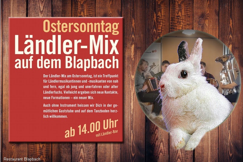 Der Ländler-Mix am Ostersonntag ist ein Treffpunkt für Ländlermusikantinnen und -musikanten von nah und fern, egal ob jung und unerfahren oder alter Ländlerfuchs. Vielleicht ergeben sich neue Kontakte, neue Formationen – ein neuer Mix. Auch ohne Instrument heissen wir Dich in der gemütlichen Gaststube und auf dem Tanzboden herzlich willkommen.