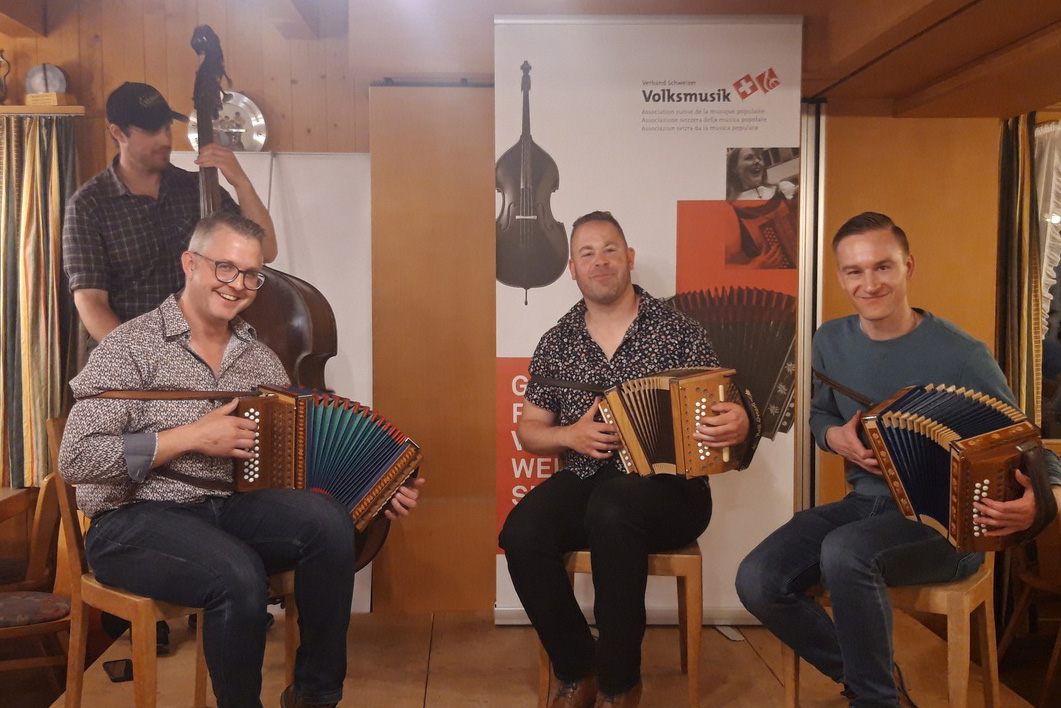 vlnr: Ruedi, Florian, Matthias und Daniel (vo de Roteflue ds Wiggen)Der junge und begeisterte Ländlermusikant Matthias Gerber aus Wiggen ist für die Organisation und Durchführung vom Ländler-Mix zuständig und berichtigt: "Eigentli tüe mer mitlerwile di ganz Familie Gerber de Ländlermix organisiere."